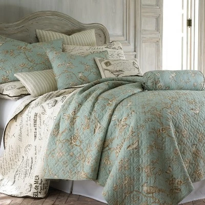 The Lyon Teal Reversible Twin Quilt Set by Levtex Home is inspired by classic French toiles. This vibrant floral toile design will immediately transform your bedroom. Made with the softest lightweight cotton, this reversible quilt features brown and cream floral bird toile on a rich teal ground, reversing to a teal, brown and cream stripe on the other. The Twin Quilt Set is machine washable and includes the quilt (68x86in.), one standard pillow sham (26x20in.). Enjoy this for years to come!