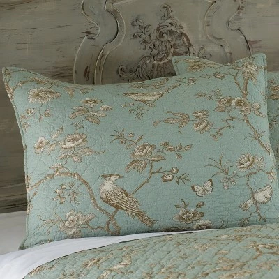 - THE LYON TEAL DESIGN: One of our most popular quilt sets, Lyon Teal is inspired by classic French toiles, with a brown and cream floral bird toile on a rich teal ground and a charming reverse pattern of teal, brown and cream stripe. The matching shams are randomly cut from the same fabric as the quilt, making each sham unique and not identical to any other sham. The decorative pillow is a bonus – putting the finishing touch to your bed or on a couch or favorite chair.