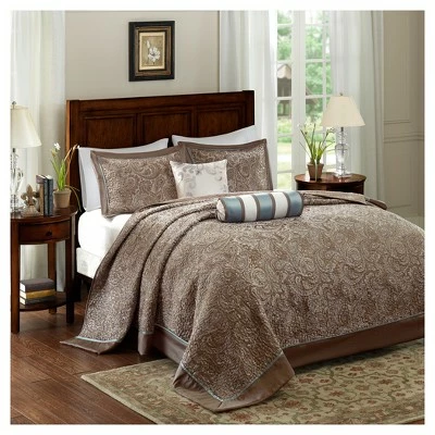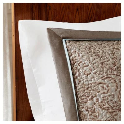 The Whitman 5pc Reversible Jacquard Bedspread Set provides a classic update for your bedroom. The jacquard weave is inspired from an updated paisley motif and is woven into a beautiful combination of a soft blue, taupe, and a hint of platinum for a touch of sheen to your bedding. The quilted bedspread and shams offer beautiful details with a taupe flange and blue piping. The reverse is a rich taupe color, while two decorative pillows feature pleating and embroidery details that coordinate with the top of the bed to bring the entire look together.