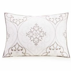 Bring home a taste of the country with the Gwen quilt set. Embroidered with wreaths of lavender flowers with green leaves on a white cotton face . The binding is made of a lavender floral fabric that adds a touch of pattern to the soft scalloped edge. Vermicelli quilting adds a subtle allover pattern. 100% cotton face and fill with a brushed polyester backing.