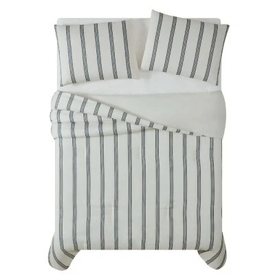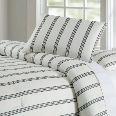 This easy to coordinate three part stripe pattern runs from head to toe on the bed for an easy and timeless coordinate. The cloth uses a black print on a solid color base cloth. The base cloth is our Truly Soft 100% microfiber polyester fabric that is double brushed for softness. Face and back is 100% microfiber with 100% polyester fill. This item is machine washable, but please be sure to use appropriate sized machinery to avoid any excess wear on the items.