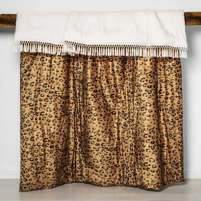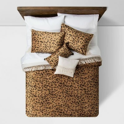 The Cassina Leopard Velvet Comforter Set from Opalhouse™ is the perfect pick for upgrading your bedroom decor with a fierce pop of style. A soft-filled comforter featuring a wild leopard print over a light-brown background reverses to solid white, and is trimmed with crochet edging with tassels for a unique touch of texture. The pillow sham and one decorative pillow coordinate with the comforter, while the other decorative pillow comes in solid white along with tassel-fringe detail to create a stunning look. Simply add your own sheets and other decorative pillows to create a stylish and comfy bedroom space.