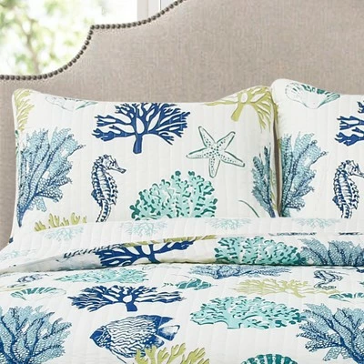 Any beach lover would love Lush Décor’s Coastal Reef Quilt 3pc Set for his or her bedroom. This also makes a great option for a guest bedroom or any room in a beach home. The reverse side of the Coastal Reef Quilt 3pc Set is light colored reefs on a white background. The reversible nature of this quilt gives you the option to switch up the look of your room as often as you like simply by turning the quilt over. This Coastal Reef Quilt 3pc Set includes a soft reversible 100% cotton quilt and two matching pillow shams. This set is available in both Full/Queen and King sizes. For your convenience, it is safe to machine wash and tumble dry this quilt set. Please be sure to follow all instructions on the label.