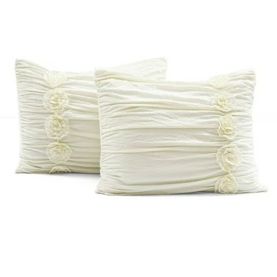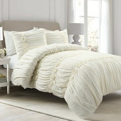 Due to popular demand, our Darla Comforter Set is back! This is a perfect comforter set if you are looking for something that has great workmanship and also is simply beautiful. Along with the ruching, there is hand crafted flower details that create a soft and lovely vision for your bedroom. This Darla 3 Piece Comforter Set is ideal for the lovers of shabby chic style, French country style, cottage style, or farmhouse style, as well as those who just enjoy a more feminine and frilly decor style. The texture of the Darla 3 Piece Comforter Set has a calming effect, adding a touch of elegance with its ruching and flowers. It would look fabulous in a master bedroom or a guest bedroom. It would also work in a teenager’s room or your child’s first big girl bedroom. The Darla 3 Piece Comforter Set includes one soft and luxurious 210 GSM comforter and two matching pillow shams. This set is available in both King and Full/Queen sizes in your choice of white, ivory, or light gray. Due to the delicate nature of the ruching and floral details, this set is labeled dry clean only. Part of the Darla Collection. Oeko-Tex Certified.
