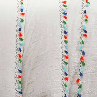 This fun and eclectic bohemian style comforter set features rows of colorful tassels on the comforter and a border of colorful tassels on the pillow shams. This Boho Tassel 3 Piece Comforter Set creates the look of a rainbow in the bedroom without being too loud. The Boho Tassel 3 Piece Comforter Sets tassels add eye-catching detail and create a unique boho look to enhance an otherwise minimalist design. It would work perfectly in a teen’s bedroom, a guest bedroom, a dorm room or a first apartment. This Boho Tassel 3 Piece Comforter Set includes one soft and luxurious 230 GSM comforter and two matching pillow shams. It is available in both King and Full/Queen sizes. Due to the delicate nature of the tassels, this set is dry clean only. Oeko-Tex Certified.
