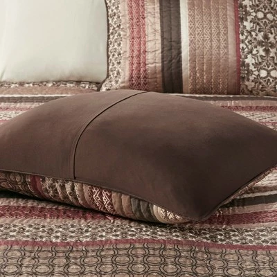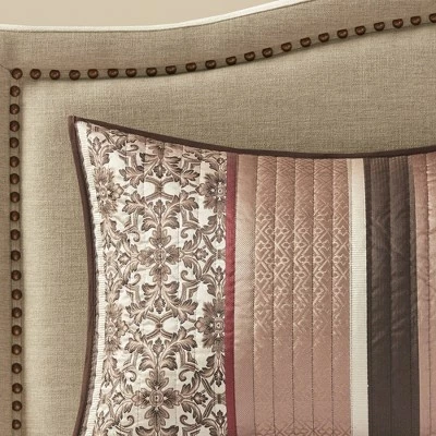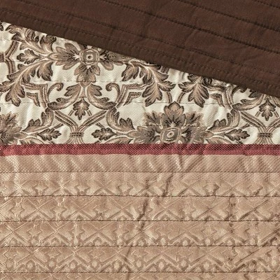 Update your bedroom with the sophisticated style of the Cambridge 5pc Reversible Jacquard Coverlet Set. A creative color combination with a pieced jacquard design is beautifully displayed on the coverlet and shams, for an elegant transitional appeal. One square decorative pillow and one oblong pillow feature embroidery and pleating details that pull the jacquard bedding set together. Soft to the touch with cotton-rich filling, this jacquard coverlet set is machine washable for easy care.