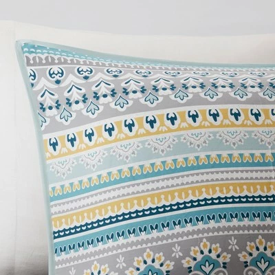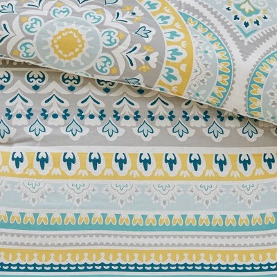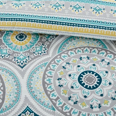 Revitalize your space with the Corynn 7pc Reversible Cotton Sateen Comforter Set. Rich and vibrant colors come together in an eye-catching medallion print on the cotton sateen face of the comforter. The cotton percale reverse flaunts a striped design in various patterns and motifs with a matching color palette. Matching shams mirror the captivating patterns seen on the comforter. Three decorative pillows complement the bedding set with coordinating colors and embroidered details. A solid bed skirt is also included to give this cotton comforter set a beautiful finish. Machine washable for easy care, this comforter set adds a touch of charm to your kid’s bedroom.