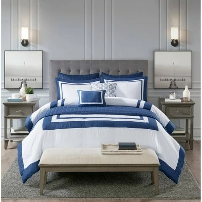 Create the perfect look in your bedroom with the Lawerence 8pc Comforter and Coverlet Set Collection. This hotel bedding collection includes a comforter and coverlet that both come with matching shams for a simple, yet luxurious look. The soft comforter and shams showcase a bold border on a light ground with a solid reverse, while the coverlet and its shams display a window pane end-to-end quilting pattern. Two decorative pillows, one square and one oblong with embroidered and pieced details provide the perfect finishing touches to this 8pc bedding set. Great for year-round use, this comforter and coverlet set collection provides exceptional warmth, comfort, and style to your bedroom decor.