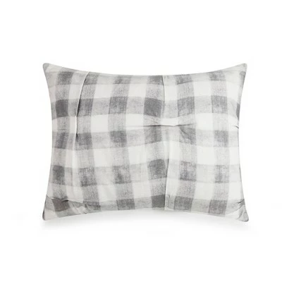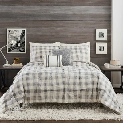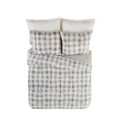 Bring a cozy casual vibe to your room with the Maddie Comforter. This print is a modern take on buffalo check with texture. This comfortable cotton fabric is crafted with tucks to add some texture and style. This bedding set is complete with two matching decorative pillows. The square pillow is a grey heathered soft chenille. The oblong pillow is ecru cotton with stripes of embroidery.