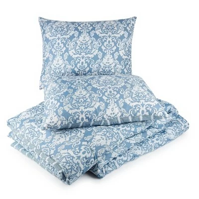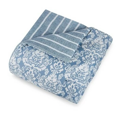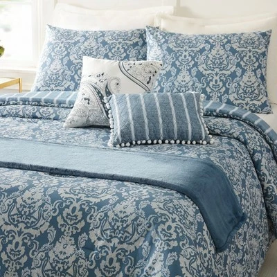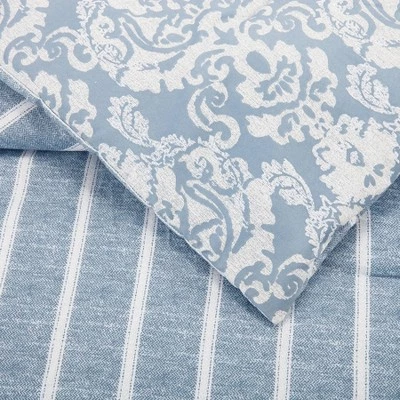 Blue and white is always right. This subtly distressed damask pattern reverses to a stripe. Chambray blue accent pillows and a cozy plush throw complete the timeless look. The Jessica Simpson Tonal Damask 6 piece comforter set includes a comforter, 2 pillow shams, 2 decorative pillows, and 1 coordinating throw. Comforter, shams and throw are machine washable. Decorative pillows are spot clean only.