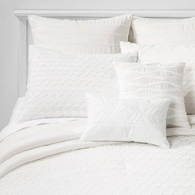 The Mia Clip-Jacquard Comforter Set will dress up your bedroom with lasting comfort and elegance. Made from a midweight fabric in a pristine white color, this comforter bedding set features an exquisite clip-jacquard construction featuring an elegant mix of geometric patterns on the included shams, decorative pillows and comforter for a textured look — and the white bedskirt adds the perfect finishing touch.
