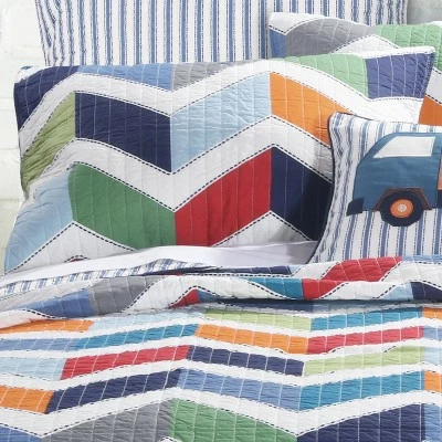 The Dominik Reversible Quilt Set by Levtex Home is inspired by childrens’ building blocks. This fun multicolor design will immediately transform your bedroom. Made with the softest lightweight cotton, this reversible quilt features colorfully striped chevrons in shades of green, blue, red, and orange and white, reversing to simple blue stripes on the other. The Twin Quilt Set is machine washable and includes the quilt (66x86in.) and one standard pillow sham (26x20in.) Enjoy this for years to come!