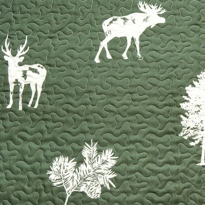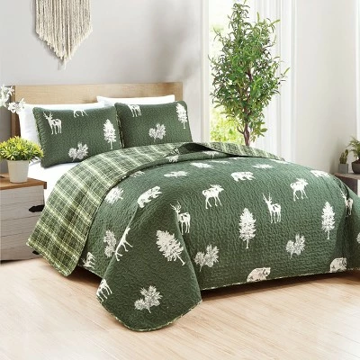 The Great Bay Home Lodge Printed Quilt Set adds a rustic flair to a bedroom or guest room. It features a charming collection of camp prints, including bear, deer, moose, and trees in a plaid design. Combining a cotton/polyester filling with a 100% microfiber cover, this quilt makes a versatile bedspread in all four seasons. Stay toasty warm in winter, or enjoy its lightweight warmth in the other seasons. Machine washable and easy-to-care for, this quilt is the perfect mix of beauty and durability.