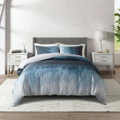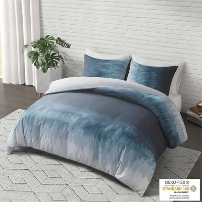 A gorgeous blend of style and comfort, the CosmoLiving Jessa Cotton Printed Duvet Cover Set offers a fashionable update to your bed. This 100% cotton duvet cover and shams flaunt a modern dip dye print that creates a beautiful contemporary design. A soft, light blue reverse complements the modern look, while the 2 pillow shams complete the cotton duvet cover set. Machine washable for easy care, this dip dye duvet cover set is OEKO-TEX certified, meaning it does not contain any harmful substances or chemicals to ensure quality comfort and wellness. A button closure at the foot end secures a padded insert within the duvet cover and inside corner ties prevent it from shifting (insert is NOT included).