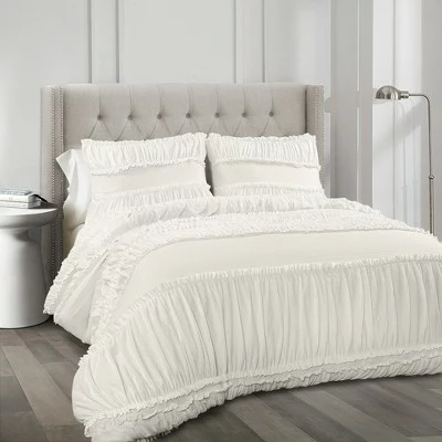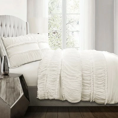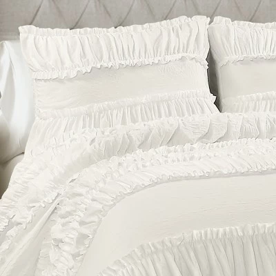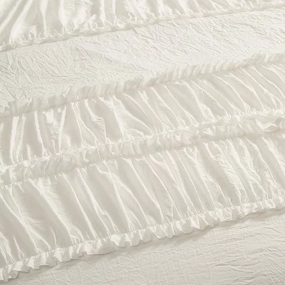 You will sleep like a baby when you add this amazingly soft Nova Ruffle 3 Piece Comforter Set to your bed. Beautiful ruffles and ruching detail give it an incredible textured look. This Nova Ruffle 3 Piece Comforter Set is ideal for a master or guest bedroom in just about any home decor theme. Whether you love shabby chic, traditional, modern or cottage style home decor, this set can fit right in with any of those. The stripes of ruffles on the comforter and the pillow shams create a whole new dimension to the bedroom. The texture of the Nova Ruffle 3 Piece Comforter Set has a calming effect, adding a touch of elegance with its ruching and ruffles. The Nova Ruffle 3 Piece Comforter Set includes a soft and luxurious 230 GSM comforter and two matching pillow shams. It is available in both King and Full/Queen sizes in off white. Due to the delicate nature of the frilly ruffles, this Nova Ruffle 3 Piece Comforter Set is labeled as dry clean only. Part of the Nova Ruffle Collection. Oeko-Tex Certified.