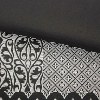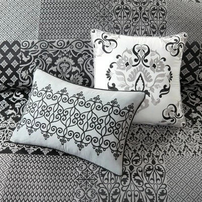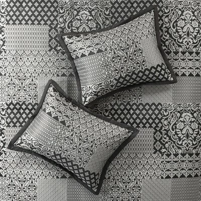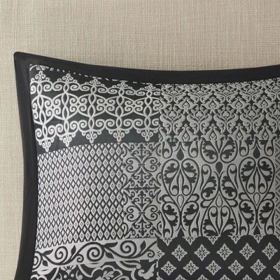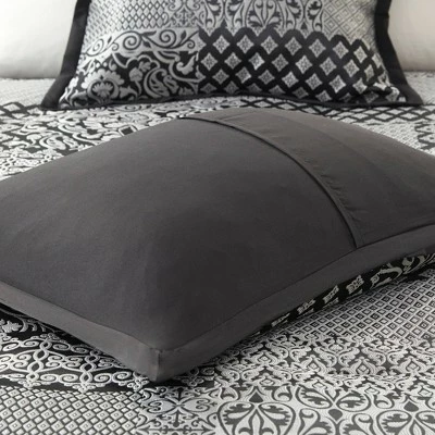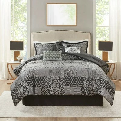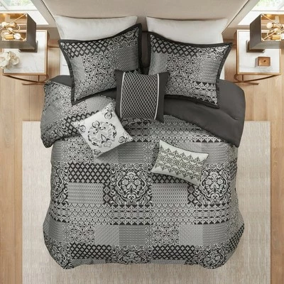 Elevate your bedroom with the bold elegance of the Hendrix 7 Piece Jacquard Comforter Set. This polyester jacquard comforter flaunts a medallion design on the top with a soft microfiber reverse, for a luxurious transitional look. The 2 matching shams pair handsomely with the comforter to complement the sophisticated design. Also included are 3 decorative pillows with embroidered details that add dimension to bed and a solid bed skirt that provides a clean finishing touch. Machine washable for easy care, this jacquard comforter has an antimicrobial treatment to provide built-in freshness protection, inhibit growth of odor causing bacteria, and keep the fabric newer, longer.