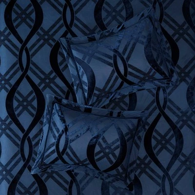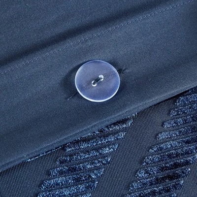 Dress up your room with the 3pc Morgan Velvet Duvet Set. Decked out in an ornate wavy pattern on a diamond-checkered base made by shiny velvet flocked detailing on the top, this bedding set reverses to a solid hue to add a touch of style to your room. In a rich blue hue and featuring a lightweight fabric construction for all-season use, this multipiece bedding set comes with a duvet cover, along with two matching pillow shams to complete the top of your bed with stunning appeal. Plus, the string ties and button closure on the duvet cover help keep the insert from bunching up, while the four-inch envelope closure on the shams keeps the pillows nicely tucked in and out of sight for a neat finish.