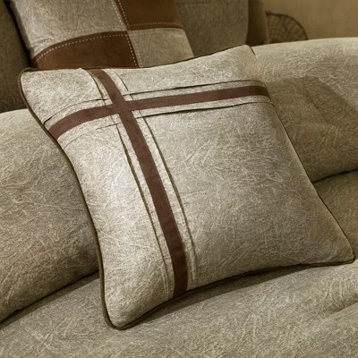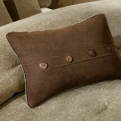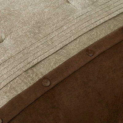 For a warm, lodge look in your space, the Powell Comforter Bedding Collection is perfect for you. The unique faux suede fabric used in this set has a textured earthy print pieced with polyester microsuede at the bottom and buttons for a personal touch. Three decorative pillows using piecing and embroidery of both top of bed fabrics completing this cohesive look. Machine washable for easy care, soft to the touch with hypoallergenic filling, this comforter set adds a touch of charm to your bedroom.